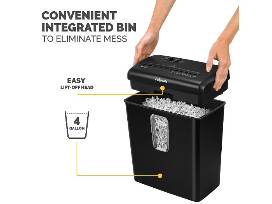 Convenient Lift Off Head to Eliminate Mess: 4-gallon bin neatly contains over 80 shredded sheets and is easily emptied with lift-off head