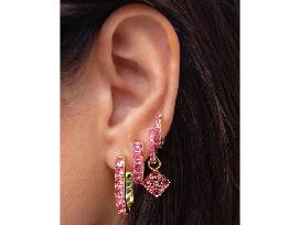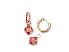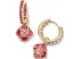 The Dira Yellow Gold-Plated Crystal Huggie Earrings in Pink Mix feature bedazzled huggies with removable charms shaped like Kendra Scott's iconic logo. They're versatile, lightweight, and made with effortless styling in mind.