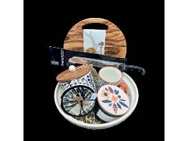 The package also includes a beautifully crafted ceramic mixing bowl, a stylish ceramic container, a cozy coffee mug, a chic cutting board, a sharp cutting knife, and a soothing candle to set the perfect ambiance.