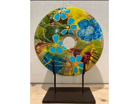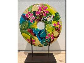 1This is a stunning hand painted disc with a metal stand created by Utah artist Stacy Philips. It measures 18" x 14" x 5" and will add "DELIGHT" to any room.