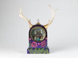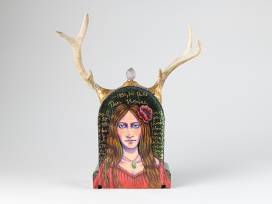 Dear Victorine - A hand-painted, mixed-media assemblage that contains found, naturally shed deer antlers; quartz crystal; mother of pearl; antique cabinet card fragments; a gilded owl; and other media arranged as a miniature cabinet of curiosities. The image of the green-eyed Victorine is painted on the reverse side of the piece as is a fragment of a letter to her from the man inside the cabinet, who sits among his many treasures. The base of the antlers are gilded with metal leaf and the painted poppies on the front and sides glitter.
