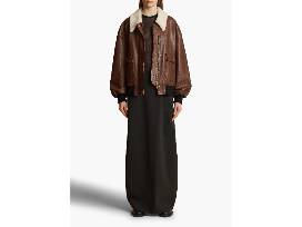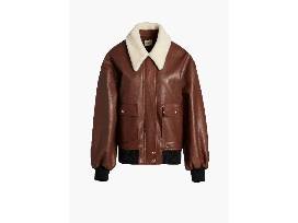 The shearling collared, zip- and snap-front silhouette combines the clean lines of a moto jacket with the softened volumes of a classic bomber. Finishing touches include a back yoke, patch pockets, and knit insets at the hem and cuffs.