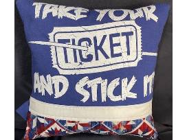 A t-shirt pillow has an attitude like the band, "Take Your Ticket and Stick It."