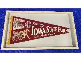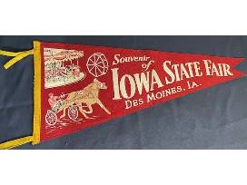 Hang this framed souvenir pennant of the Iowa State Fair on your wall. The red felt is decorated with carousel, ferris wheel and harness racing graphics.