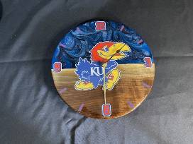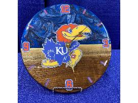 Support your favorite team with a 12" wood and epoxy resin clock. This one favors rock chalk Jayhawk - KU!