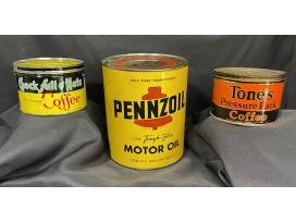 Enjoy these vintage containers from the past as an accent on a shelf. They include a one-gallon Pennzoil Oil can, a Chock Full of Nuts coffee can, and a Tones coffee can.