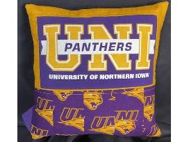 A pillow created from UNI patterned fabric and a UNI t-shirt.