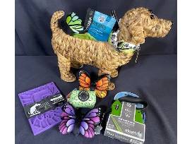 He comes packed with a retractable leash, three butterfly shaped dog toys, a zippered waste bag holder, Groovy Love lick mat, collar charm and smart ID collar.