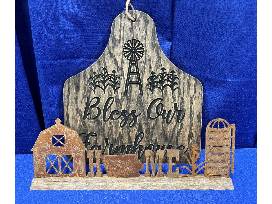 Hang this "Bless this Farmhouse" engraved sign shaped like a cow tag in your home. It can be accented by a farm and home themed sign featuring metal cutouts that can be rearranged in a barn board stand.