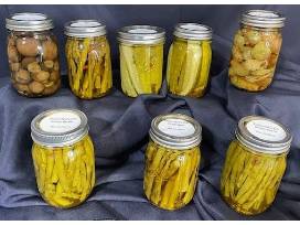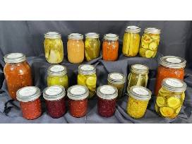 The selection includes pasta sauce, chili base, salsa, applesauce, jam, relish and a variety of pickles.
