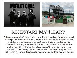- The package includes 12 concert tickets and 12 gate admission tickets for Motley Crue concert with Pop Evil on Wednesday, Wednesday, August 14. This is not a private suite but is limited to 24 people.