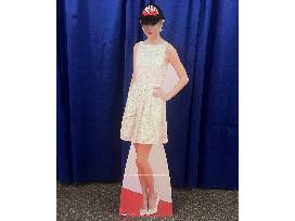 This Taylor Swift cutout is showing her KC Chiefs pride by wearing a hat.