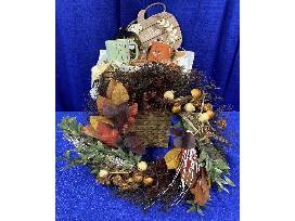 - Two handblown glass pumpkins coordinate with a wreath and small votive candles.