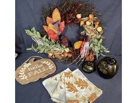 - There is also a wooden pumpkin sign, oversized coffee mug and tea towels.