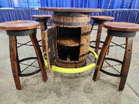 - Store and enjoy your bourbon from a whiskey barrel bar with a 36" top and four oak stave stools with wooden swivel seats.