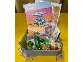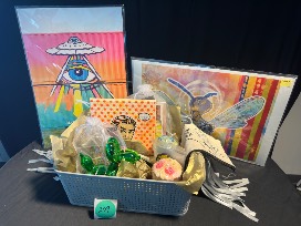 This eclectic basket is a delightful mix of creativity and fun, featuring original artwork by Robin Slonina alongside whimsical gifts and unique art pieces from Slonina ARTSpace. With everything from art prints and handmade candles to quirky perler bead creations and wooden wall art, it's the perfect blend of artistic expression and playful charm, all tied together with the spirit of the local community gallery just two blocks from LVA.