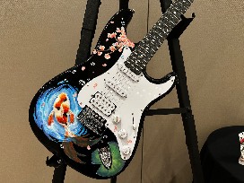 Media: Acrylic paint, Paint pens, Clay, Gloss medium, Iridescent medium on an electric guitar