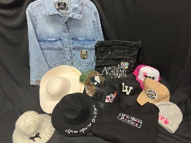 9 Custom Designed Hats (White fuzzy bucket hat with bow, Black fedora, tan LV Raiders, 702 Pink Trucker Hat w/cards, Black Trucker Hat w/cards and basketball, Black ball cap w/LV, Camo Trucker Hat w/CA & NV neighbor, Grey beanie with pink dice and flames, Cream wide brim felt hat)