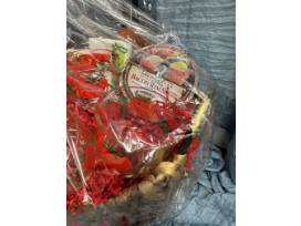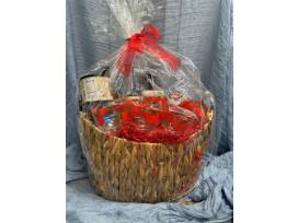Basket includes everything needed for an amazing Bloody Mary! Including, two bottles of Bloody Mary blend, one bottle of Tower Vodka, Bloody Mary kitchen towel, cocktail stirrers (15), Bloody Mary medley, Blue Cheese stuffed olives, six vintage Bloody Mary glasses, Bloody Mary peanuts and bacon rimshot salt rim.