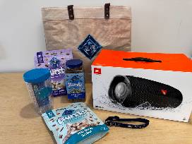Cat Basket: Bursts with Delish Liver and Beef Treats, 5 oz, Bursts with Paw-Licken Chicken Treats, 12-oz tub, Bursts with Savory Seafood Treats, 5 oz bag, cat collar. And for kitty's owner - a Blue Buffalo mug and JBL Xtreme Speaker to get the weekend party started and a sturdy tote to carry it all home easily.