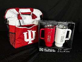 This package contains two Indiana Hoosiers NCAA Big Boy lawn chairs, one Indiana Hoosiers backpack cooler, and a set of two 40-ounce Indiana Hoosiers insulated tumblers.