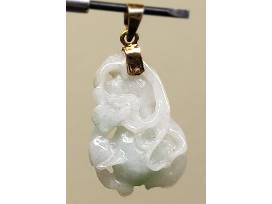 This rare 14K gold jadeite carved gourd pendant not only showcases exquisite craftsmanship and the natural beauty of jadeite, but it also symbolizes prosperity and protection in many cultures.