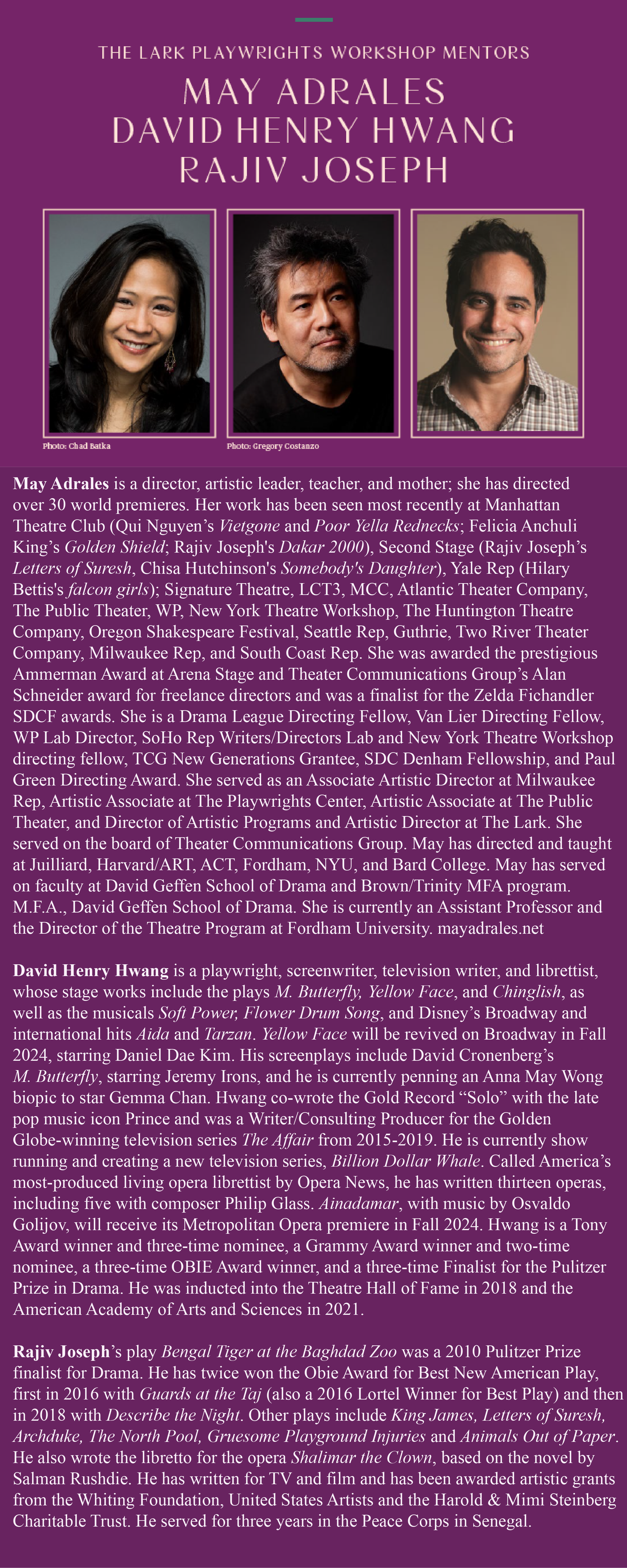Help us honor Barbara & Rodgin Cohen and The Lark Playwrights Workshop Mentors with a fully tax-deductible gift.