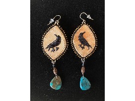 Birchbark earrings backed with home tanned moose hide, decorated with Ravens made with porcupine quills and with silverberry beads, faceted spinel stones and turquoise drops. Made by Canadian First Nation artist Naomi Bourque, the Raven design is especially meaningful because Ravens are sacred to the First Nation tribal community.