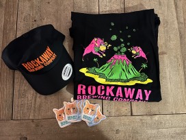 A case of specialty beer (24 cans of various brews), plus a logo t-shirt, baseball cap and stickers from Rockaway Brewing Co.