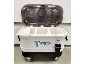 Become the Life of the Party with this portable cooler/bar. Perfect for waters, sodas, or adult beverages, this cooler will certainly make you the center of attention. Is equipped with wheels to make party movement easy!
