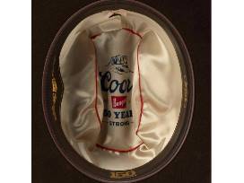 - Brown leather interior sweatband with gold foil & Coors Banquet 150th Anniversary trims.