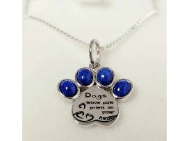 This lapis and silver dog paw pendant inspires devotion with the inscription "Dogs leave paw prints on your heart".