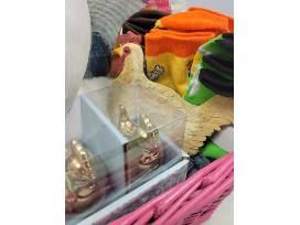 - Acrylic colorful chicken charm (around stuffed chicken's neck) approximately 3" x 3"