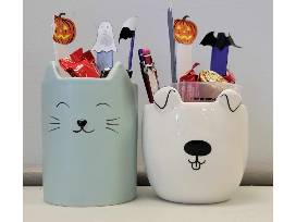 - Cat mug and dog mug filled with human treats