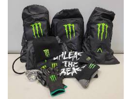 • 4 duffel bags with Monster branded items including socks, beanie, gloves and accessories