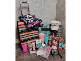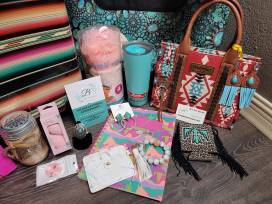 Travel with style! Included within this basket is a Carry-On Size Rolling Luggage, Insulated Cooler, Wrangler Crossbody, Western Notebook, Turquoise Tumbler with a Removable Bluetooth Speaker! As well as a Spa Set, Sugar Cookie Candle, 2 Necklaces, 2 Pairs of Earrings, a Western Ring and a comfy Reversible Blanket!