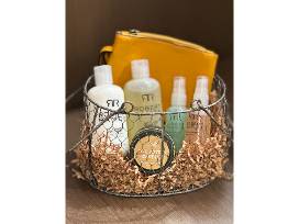 An assortment of celebrity styler Robert Ramos haircare products including shampoo, conditioner, volumizing spray, leave-in spray, and carrying bag in a wire basket!