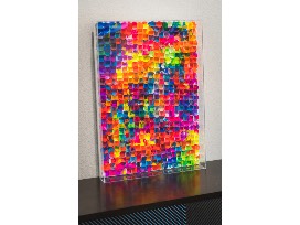 Classroom art created by the entire 1st grade class. Each student made their own unique paper with acrylic paint that are in interlocking circles compiled into a phenomenal piece of art that would look beautiful in any home or office. It is topped with resin.