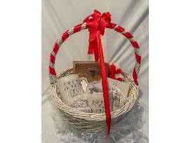 This basket includes floral printed Rae Dunn "Things" container, floral printed Rae Dunn drink coasters, Rae Dunn rustic Recipe Box (including dividers & recipe cards), and 2 Rae Dunn "Amazing Grace" coffee mugs.
