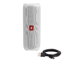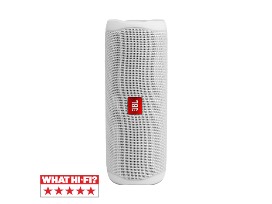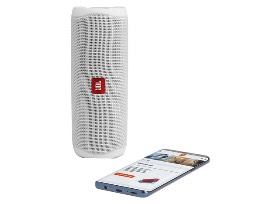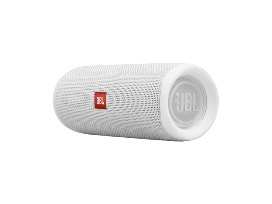 Take your tunes on the go with the powerful white JBL Flip 5. Their lightweight Bluetooth speaker goes anywhere. Bad weather? Not to worry. With its waterproof design, you can rock out to their signature sound rain or shine. Pair two JBL PartyBoost-compatible speakers together for stereo sound or link multiple JBL PartyBoost-compatible speakers to create a bigger party. Enjoy up to 12 hours of play time for your favorite music. Stand it vertical or horizontal.