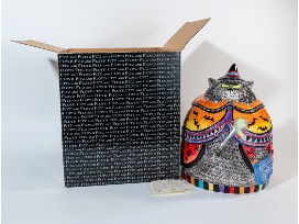This product is a ceramic cookie jar with a lid in the shape of a round, large, multicolored witch cat. The jar has a bat pattern and is decorated with Halloween-themed details. It measures 13 inches in height and length, and 28.5 inches around the width. The jar is part of the Fitz and Floyd franchise and was manufactured in China in 2002. It comes with a box and is an original. The jar is reusable, easy to clean, and has one compartment.