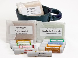 Moondance Soaps Basket contains 3 mini soaps (Lemongrass, Eucalyptus Spearmint, Precious Amber); 9 Shea Butter lip balms (Honey, Mint, Citrus, Strawberry, Strawberry Cream, Vanilla, Chocolate, Healing Blend, and Unscented); and a handmade mug. Moondance Soaps is a local small business that manufactures products in small batches with high quality ingredients.