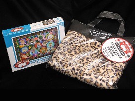 Cheetahs & Kitties Package - includes a fashionable and functional reusable cheetah print gift tote made of recycled materials, a Luxurious Minky Cheetah print faux fur lap-size throw 40" x 40" that is perfect for you or your kitty!, a Thermal-lined leakproof cheetah print lunch tote with shoulder strap and outer pockets 8.7" L x 11' H x 6.3 W, a child ruffle apron with adjustable neck strap and a Pretty Purrfect kitty design, an adult cheetah print ruffle apron with adjustable neck strap and coated cotton for easy cleaning, and a challenging and fun Cats with Hats 300-piece puzzle.