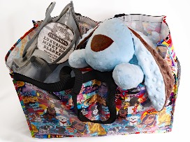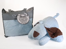 Your human puppy will absolutely love this Puppy Package! Includes a super soft blue puppy minky plush dog toy and matching blanket 40" x 40", both safe for children, as well as a 2-section tote w/ Furry Friends Pattern made from recycled material making it strong, yet lightweight. Great to carry your minky dot puppy and blankie wherever you go, or for weekend Costco runs!
