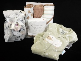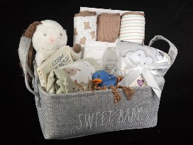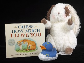 Plush Baby Blanket, Carters 0 - 3 Month Easy Zip Front Sleep Bag, Sweet Baby Basket, "Quess How Much I Love You Book", Stuffed Rabbit Toy, 6 Piece Bath Set, Rubber Ducky