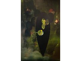 1Excavation Site IV by John Carhart Ebeling oil on board, 48 x 72.5 inches, 1993. John Carhart Ebeling was an American artist from Akron, Ohio who is known for his luminous abstract landscapes. His unique technique is created by belt sanding oil paint on plywood to show the different colors throughout.