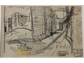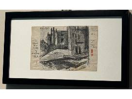 Mom's Canal, Jersey City, NJ (near the Sugar Factory) by Oscar Bluemner (1867-1938) black crayon drawing, 7.35 x 5 inches, 14.4 x 8.5 inches framed (double-sided), May 9, 1919. Born in Germany, Oscar Bluemner studied painting and architecture at the Royal Academy of Design in Berlin and traveled to America in 1893. A leading proponent of modern art in the early 20th century, Bluemner was closely linked with photographer Alfred Stieglitz and vanguard movements, such as synchronism and precisionism.