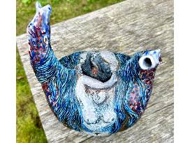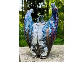 0Double Spouted Horse/Human Teapot with Dog Stopper by Adelaide Paul clay, glaze and underglaze, 11.5 x 8 x 6 inches, circa 1990s. Adelaide Paul is a sculptor residing in Philadelphia, PA. She earned her BFA from the New York State College of Ceramics at Alfred University in 1993, and her MFA from Louisiana State University in 1996. Her work is concerned with investigating the relationships between domesticated animals and humans. This double spouted piece is a sculptural vessel in the shape of two red horses with blue dots and manes brought together by the image of a nude male and detachable dog stopper.