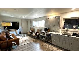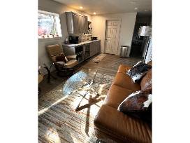 - Open-concept living / mini kitchen (with quartz counters, microwave, mini fridge, hot plate available, dishes/silver/etc);
