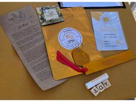 Premium Glad Bag of Gifts and 5 bags of popcorn from Kernels of Joy. Kernels of Joy is an autistic entrepreneurial venture, with the help of their moms, between two friends - Josiah and Jared - who want to spread joy through "popcorn, poetry and prizes." The young men assemble "Premium Glad Bags" that include gifts like a magnet, bookmark, key chain, lip balm and pocket stone and Jared's mom is licensed to create delicious small batch popcorn in a variety of flavors:
